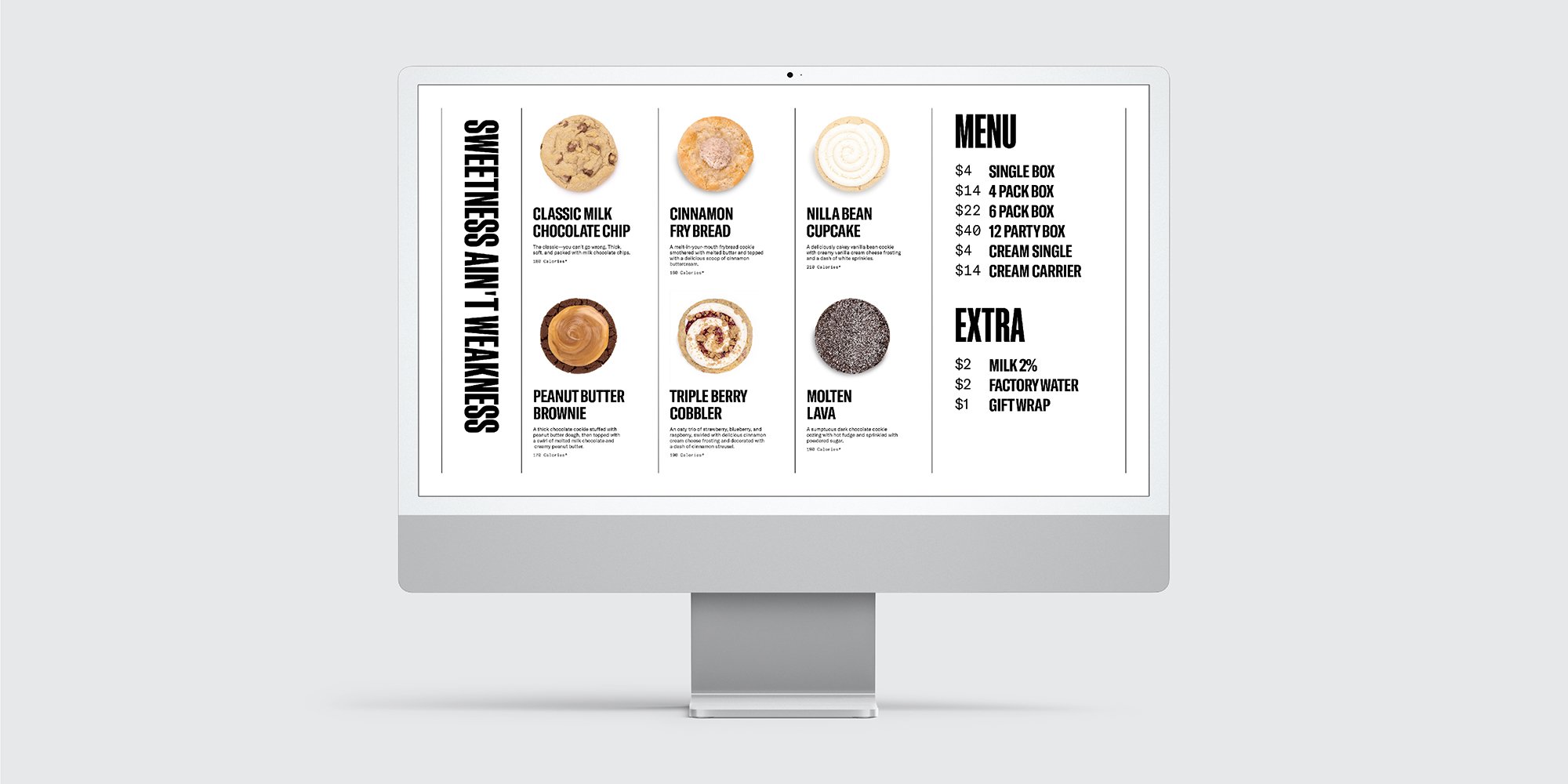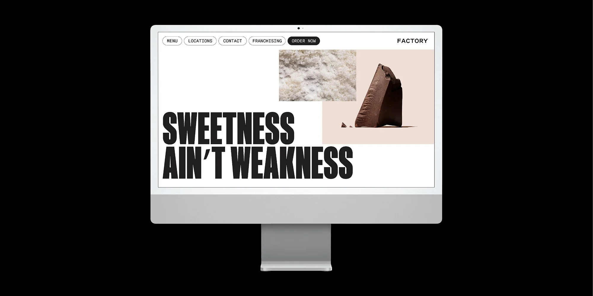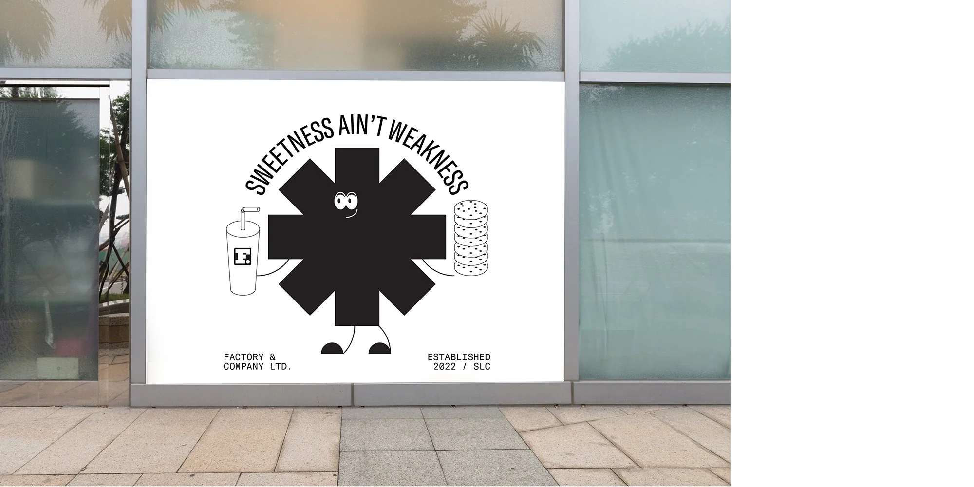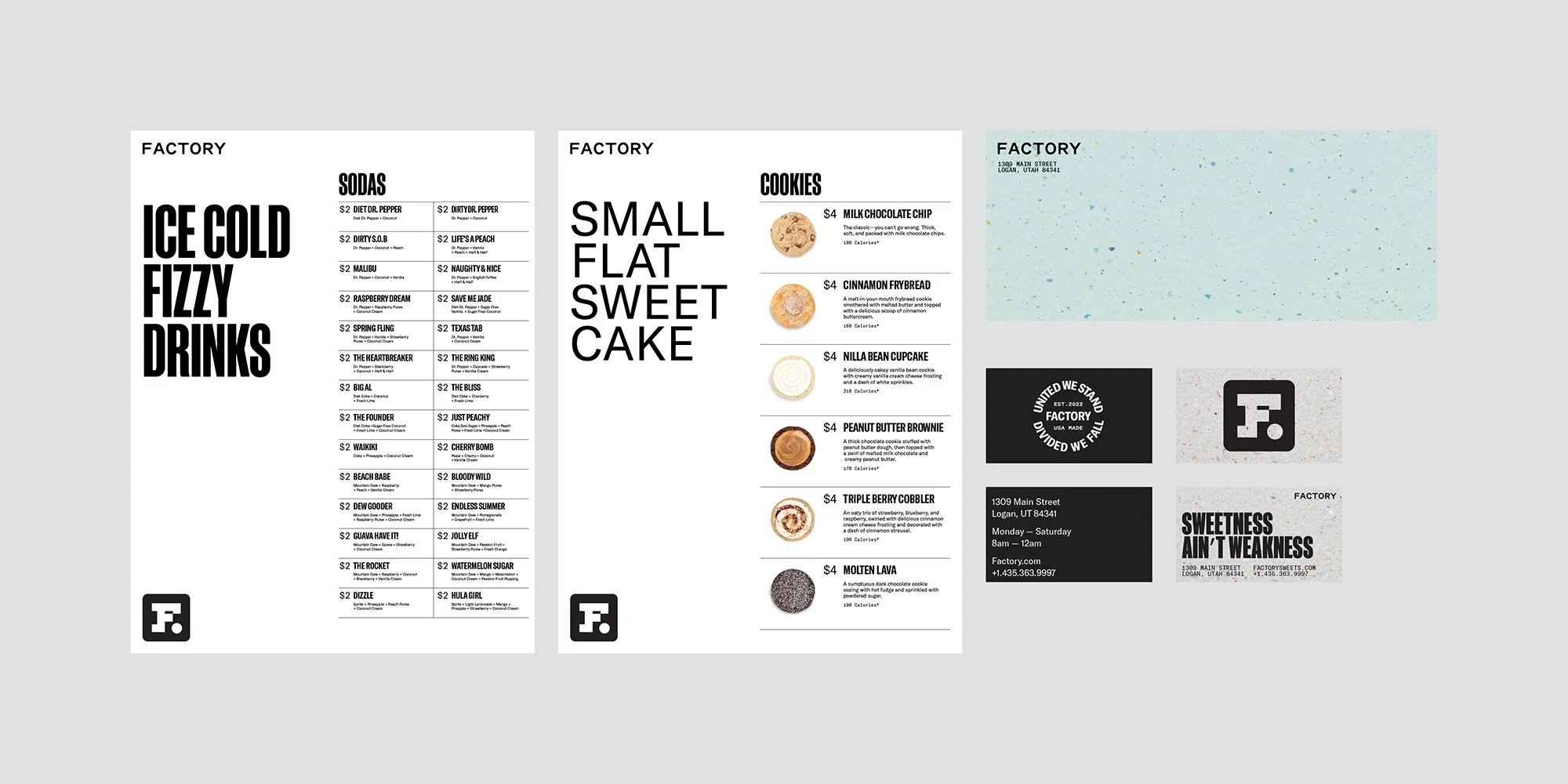 Developed a branding system for a new chain of shops that sell cookies and sodas, called Factory. Focused on an identity that would set the client apart from competitors, and resonate with a younger audience.